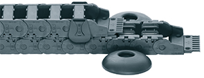 The autoglide system has now been extended and further optimised for igus® E2/000. The autoglide crossbars ensure even longer life. A clip-on glide wing ensures safe e-chain® alignment over the first few metres of travel. The eccentric guides are fastened to the floor every 2 metres.
