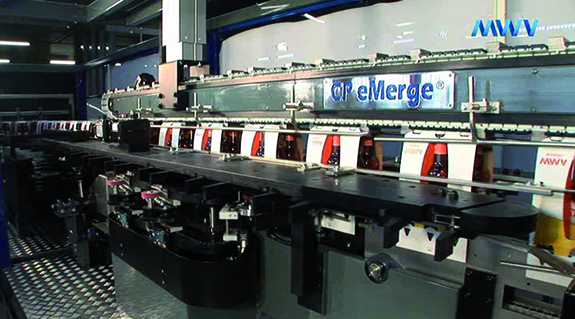 This packing machine automatically turns single bottles inside the packing into the desired position.